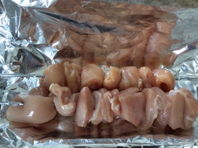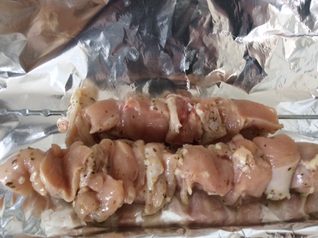 To OVEN roast, place chicken on skewers. Place skewers on foil on baking sheet and fold foil to cover. If also cooking unmarinated chicken, do the same with it, and place on baking sheet.