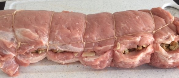 Wash pork loin. Cut lenghwise to within 1 inch of uncut side, and open the roast like a book. Make balls of the dressing and place them along the length of centre of roast. Pinch the roast edges together while pushing the dressing into the cavity. Using binding string (for roasting), tie the roast every 2 inches to hold the roast together. See below.