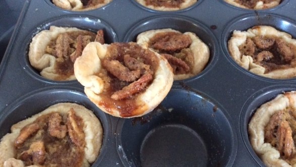 Place a small number of raisins (about 5), or 3 pecan quarters in the bottom of tart shells. Pour 1 1/2 tablespoons of batter into the deep tart shells so they are about half full. Do not fill too high, as batter will run over edge of pastry as it bakes.