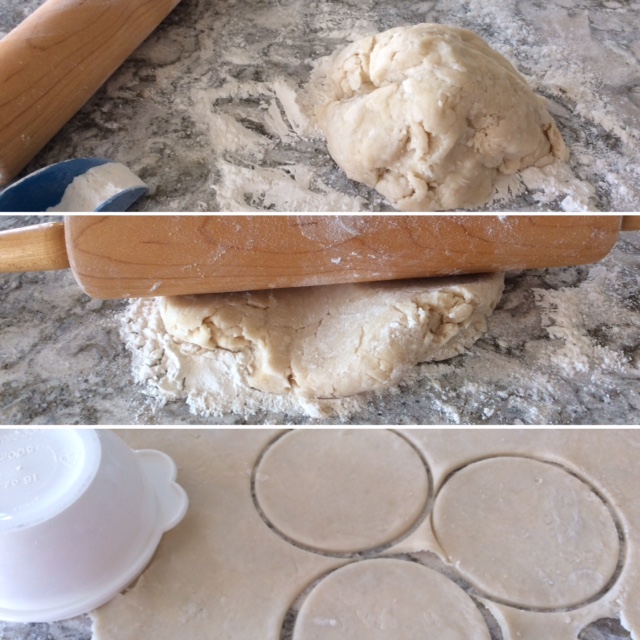 Roll out pastry. Cut tart shells with a cutter (a bowl works well) that is much bigger than the size of your pan cups.