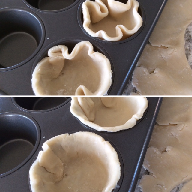 Place tart shells in the cups, and press each shell against and over the side of cups. If necessary, roll the tart shell to make it larger after you have cut it. Prick the bottom of each shell with a fork. Doing so will help keep the bottom of this flaky pastry from rising too high.